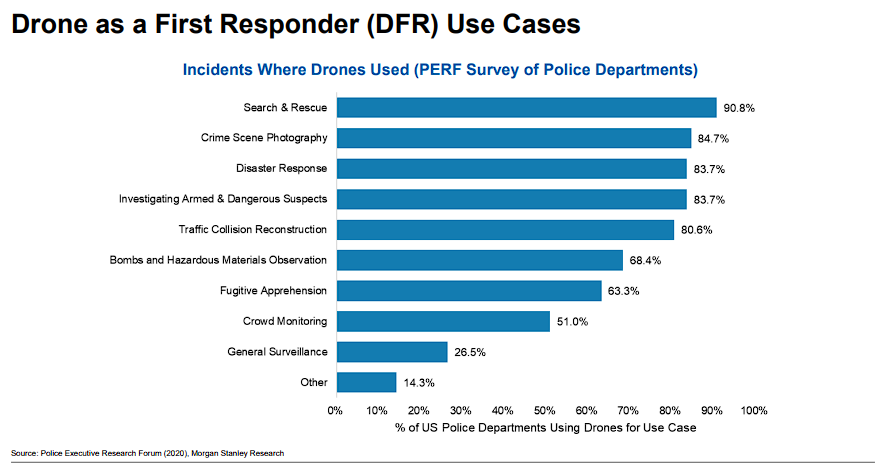 公共服务领域的应用价值同样显著。全球已有1700家美国警察局使用无人机,应用于搜救(90.8%)、犯罪现场摄影(84.7%)、灾害响应(83.7%)等场景。