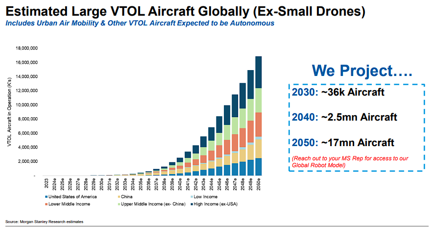 大摩模型预测,到2030年全球大型VTOL飞机将达到约3.6万架,2040 年达到250万架,2050 年将达到1700万架。