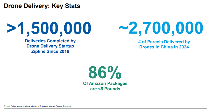 物流配送领域展现出爆发式增长潜力。Zipline自2016年以来完成超150万次配送,2024年中国无人机配送包裹量达270万个。亚马逊、沃尔玛、京东、顺丰等企业纷纷布局,针对重量5磅以下的包裹——占亚马逊包裹的86%——构建空中配送网络。