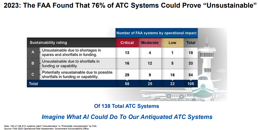 目前最大的瓶颈并非飞行器本身,而是过时的空中交通管制(ATC)系统。FAA 指出76%的ATC系统可能不可持续。只有引入AI进行自动化的空域管理,才能容纳数百万架次的新增飞行流量。