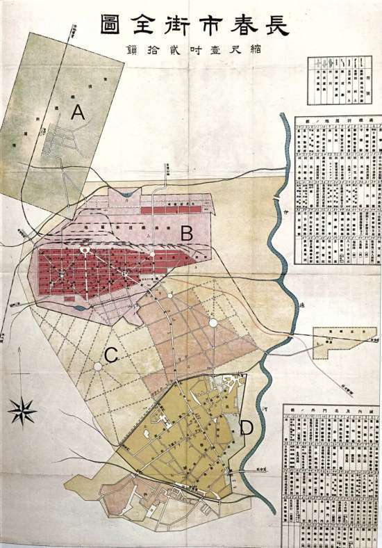1917年的长春地图,地图中,A为中东铁路附属地,B为“满铁”附属地,C为商埠地,D为长春老城